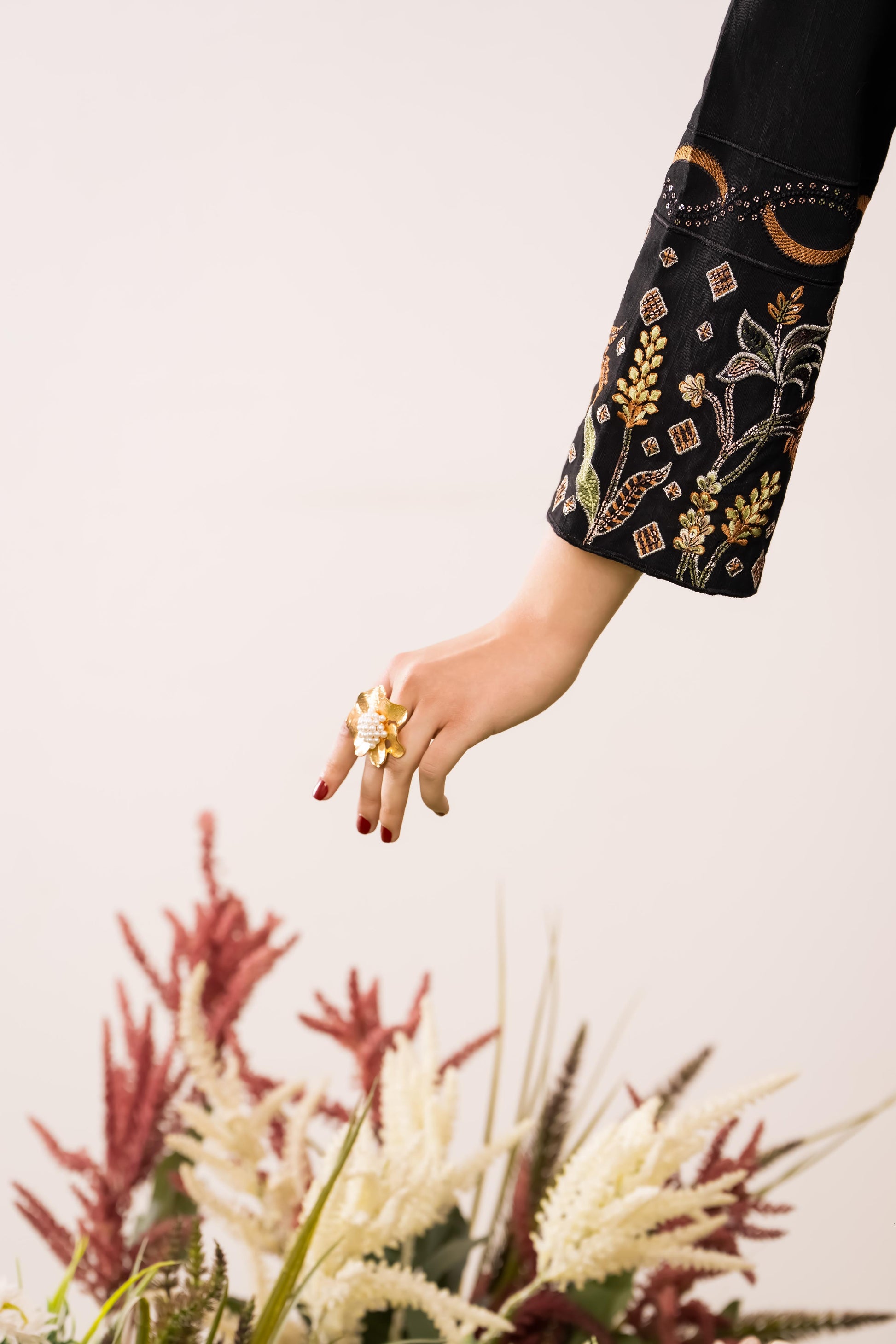 Make a timeless statement with this exquisite black 3-piece shalwar kameez, crafted from premium lawn fabric for a lightweight and elegant feel. The straight-cut kameez is adorned with intricate floral embroidery in contrasting shades, paired with a matching black shalwar. A sheer dupatta with delicate floral prints and subtle lace detailing completes the ensemble, perfect for both casual and festive occasions. This versatile suit is a wardrobe essential for effortless sophistication.